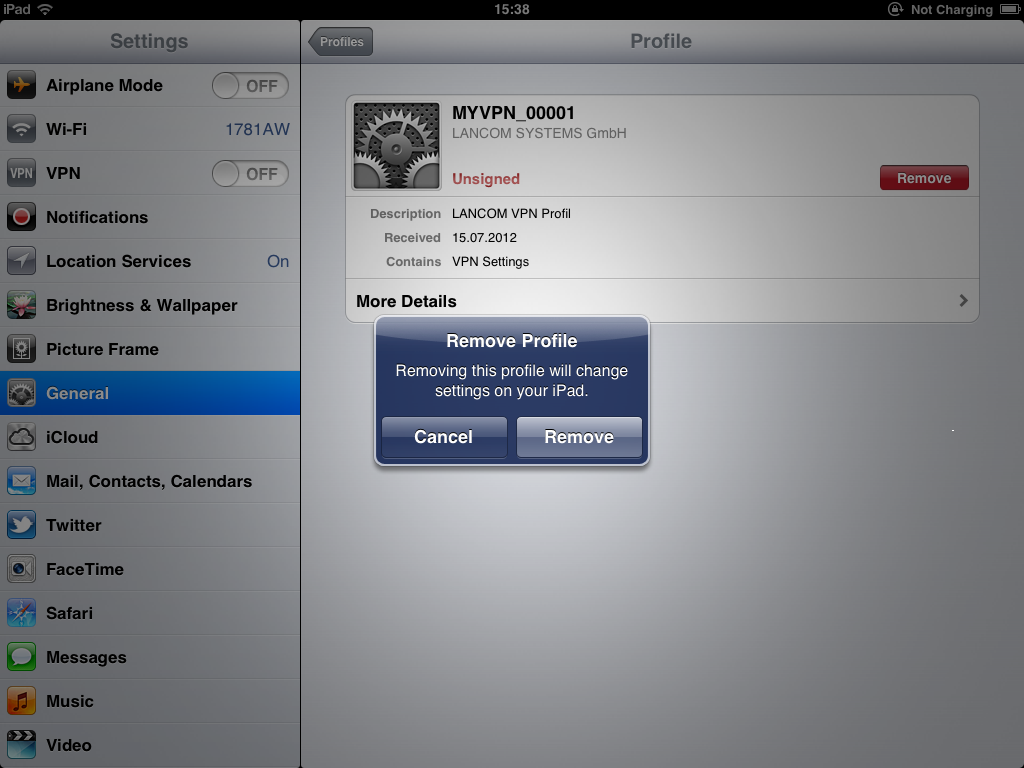 To delete the VPN profile you can use the LANCOM myVPN app: