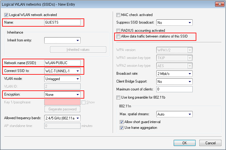 The aim of the configuration: A WLAN client that associates with the internal SSID should have access to all internal resources and the Internet via the central gateway. The access points break-out the payload data from the internal clients locally and pass it on directly to the LAN. The guests' WLAN clients associate with the Public Spot. The access points send the payload data from the guest clients through a WLC tunnel directly to the WLAN controller, which uses a separate WAN interface for Internet access.