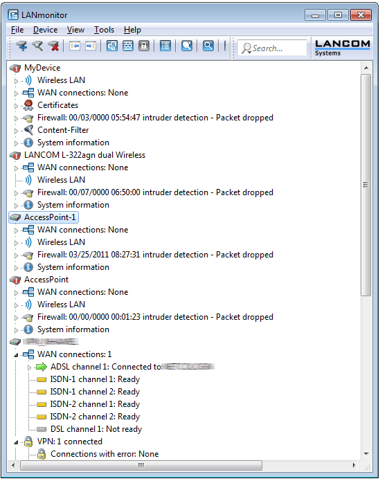 LANmonitor gives you a rapid overview of the LANCOM WLAN controllers in your network and the access points within the WLAN infrastructure. LANmonitor displays the following information, amongĀ others: