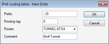 In the field Router, select from the list the name of the tunnel that you defined earlier, e.g. in the example above "TUNNEL-6TO4".