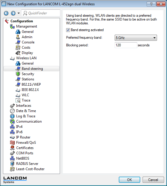 This dialog enables you to configure the settings for band steering in LANconfig.