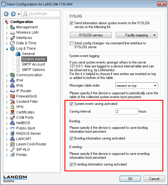 In LANconfig, the settings for the boot-persistent SYSLOG, event log and boot-log messages are to be found under .