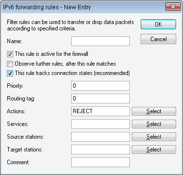 The IPv6 forwarding rules button accesses dialog where you set the rules that the IPv6 firewall should use to handle forwarded traffic.