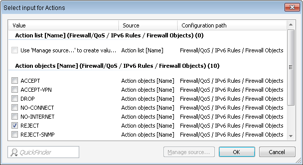 - Specifies the action that the firewall performs if the rule condition is true. Using Select you can choose one action or a list of actions.