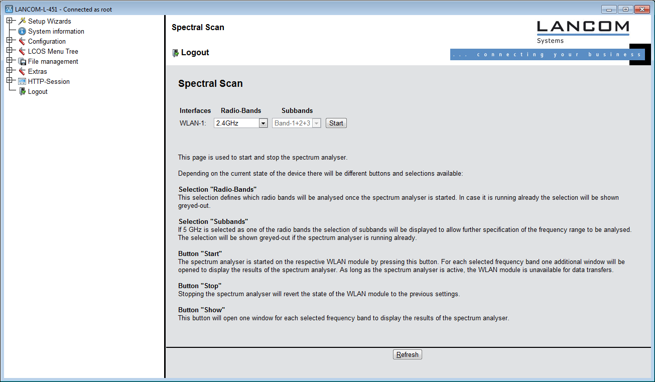 - Start: Clicking this button starts the spectral scan on the relevant WLAN module. A separate window opens for each of the selected frequency bands.