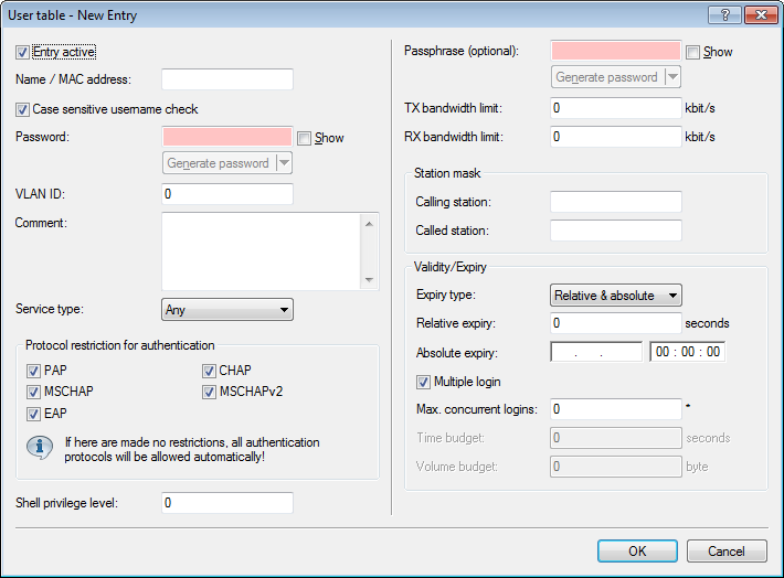 Note: Please note that, depending on the device, the number of entries can be limited with the service type Any or Login. If your device, for example, is able to manage a total of 64 Public Spot users, the LANconfig rejects them after 64. User account with the service type Any/Login requires the creation of additional user accounts with these service types. - Protocol restriction: This option limits the selection of authentication methods allowed for the user. Possible values include: