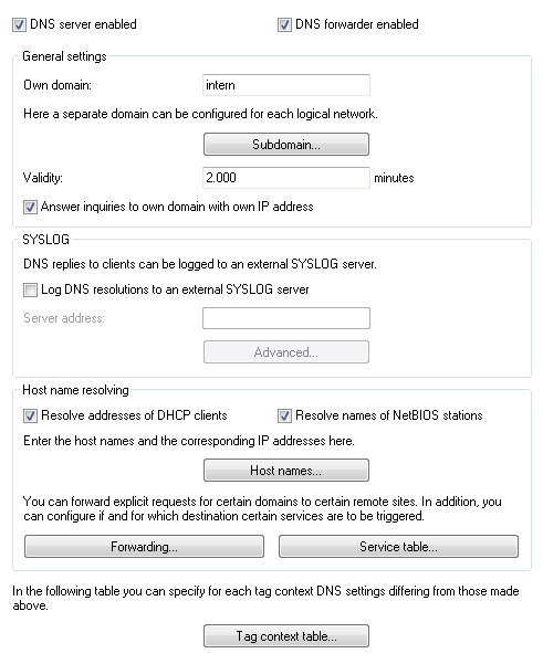 If an entry for a tag context exists, then only the DNS settings in this table apply for this context. However, if there is no entry in this table, then the global settings of the DNS server apply.