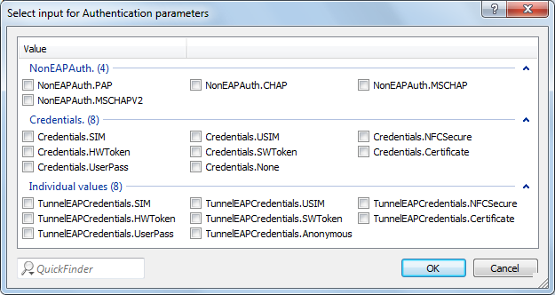 - Authentication parameters: In the window that opens when you click the Select button, select the appropriate authentication parameters for the EAP method, such as EAP-TTLS NonEAPAuth.MSCHAPV2,Credential.UserPass or for EAP-TLS Credentials.Certificate. Possible values include: