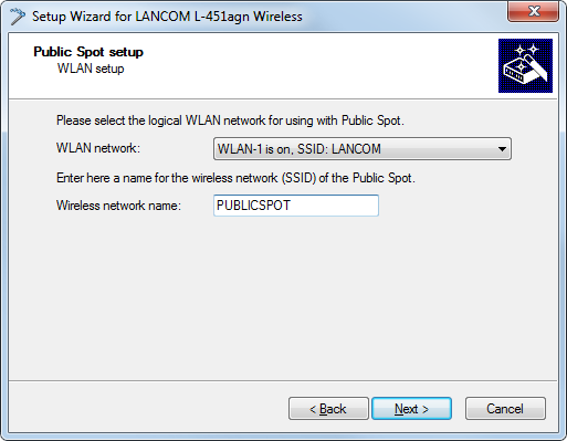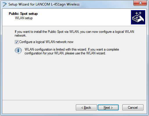 If you want the Public Spot to be available over WLAN, enable the corresponding option and then click Next.