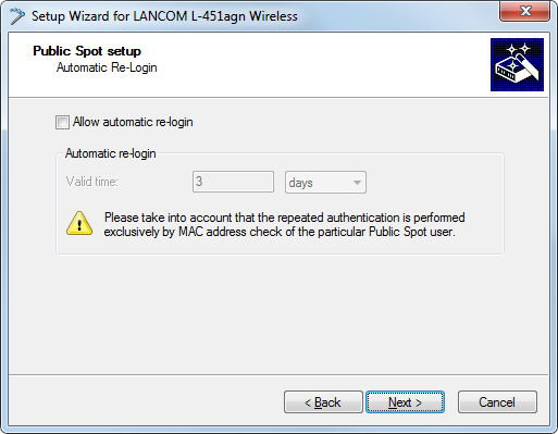 Automatic re-login option is a convenience option that allows the Public Spot to automatically authenticate known users or devices. However, if known devices are to be recognized exclusively from the MAC address of the network adapter, the fact that MAC addresses can be falsified represents a potential security risk. For this reason this option is disabled by default.