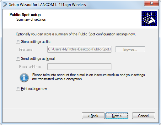 The click Next and finally Finish to complete the basic installation of the Public Spot. The Setup Wizard will now send the settings to the device.