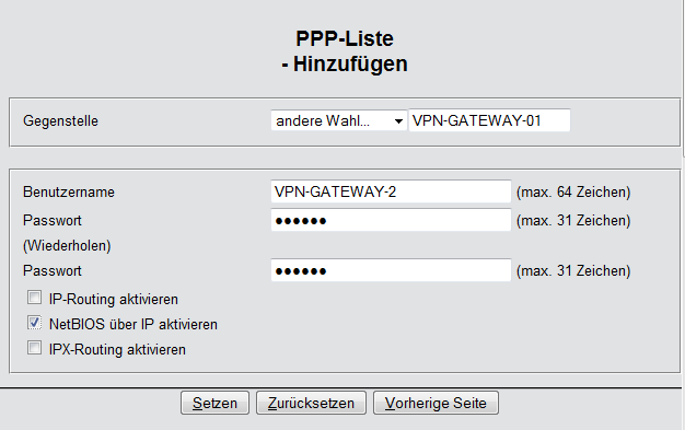 4. Bei Nutzung von LANCOM Dynamic VPN: Erstellen Sie unter Konfiguration / Setup / WAN / PPP einen neuen Eintrag. Wählen Sie als Gegenstelle das entfernte VPN-Gateway aus, tragen Sie als Benutzernamen denjenigen VPN-Verbindungsnamen ein, mit dem das entfernte VPN-Gateway das lokale Gerät erreichen soll, und geben Sie geeignetes, auf beiden Seiten identisches Passwort ein.