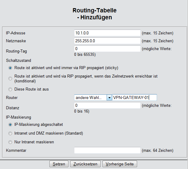 10.1.0.0 255.255.0.0 VPN-Gateway-1 Nein