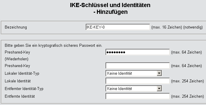 1. Legen Sie unter Konfiguration / VPN / IKE-Auth./IKE-Schlüssel und Identitäten einen neuen IKE-Schlüssel für die Verbindung an: