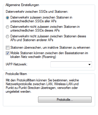 - Mobile Stationen können zwischen den Basisstationen im lokalen Netz wechseln (Roaming) Neben der Kommunikation der Clients untereinander kann hier auch eingestellt werden, ob die benachbarten APs beim Roaming Informationen über das IAPP austauschen. Das Inter Access Point Protocol (IAPP) ist ein Protokoll zur Kommunikation zwischen APs. Der “abgebende AP” bekommt so die Nachricht, dass ein bei ihm eingebuchter WLAN-Client nun zu einem anderen AP wechselt und kann den Client sofort aus seiner Liste entfernen.