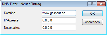 Anmerkung: Die Hitliste in der DNS-Statistik zeigt Ihnen die 64 Namen, die am häufigsten nachgefragt werden, und bietet Ihnen damit eine gute Basis für die Einstellung der Filter-Liste.Durch die geeignete Wahl von IP-Adressen und Netzmasken können bei der Verwendung von Subnetting in Ihrem LAN auch einzelne Abteilungen gefiltert werden. Dabei steht die IP-Adresse '0.0.0.0' jeweils für alle Rechner in einem Netz, die Netzmaske '0.0.0.0' für alle Netze.