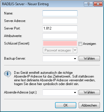 - Geben Sie hier die IP-Adresse (IPv4, IPv6) oder den Host-Namen des RADIUS-Servers an, mit dem Sie zentral die Benutzer verwalten.