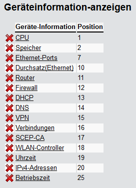 Auf der Registerkarte Gerätestatus finden Sie umfangreiche Informationen über den aktuellen Betriebszustand des Gerätes. Dazu gehört z. B. die visuelle Darstellung der Schnittstellen mit Angabe der darauf aktiven Netzwerke. Über entsprechende Links können relevante weitere Statistiken aufgerufen werden (z. B. DHCP-Tabelle). Bei wesentlichen Mängeln in der Konfiguration (z. B. ungültige Zeiteinstellung) wird ein direkter Link zu den entsprechenden Konfigurationsparametern angeboten.