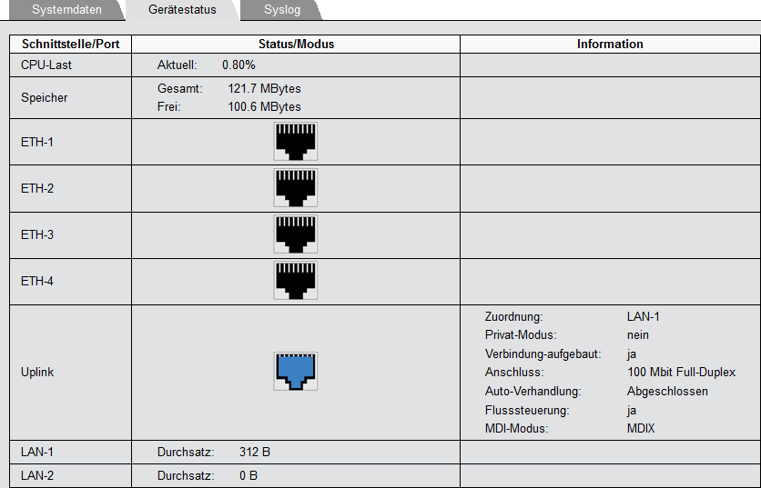 Ihr Gerät zeigt Ihnen im Menübereich Systeminformation die wichtigsten Daten zur Soft- und Hardware Ihres Gerät, physischen Verbindungen sowie die Syslog-Tabelle an.
