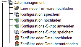 Im Menübereich Dateimanagement finden Sie alle Aktionen, mit denen Sie Dateien (wie z. B. Konfigurationsdateien und -skripte; aber auch Zertifikate, Templates und Logos) aus dem Gerät herunter oder in das Gerät hochladen. Darüber hinaus können Sie hierüber auch eine andere Firmware in das Gerät einspielen.