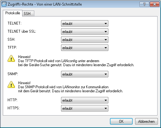 Den Zugriff auf die internen Funktionen steuern Sie - getrennt für Zugriffe aus dem lokalen Netz, aus entfernten Netzen oder aus Wireless LANs - für alle Konfigurationsdienste separat.