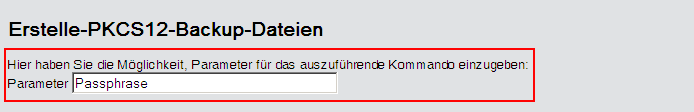 - Wählen Sie den Befehl Erstelle-PKCS12-Backup-Dateien und geben Sie als Parameter die Passphrase für die PKCS12-Container an.