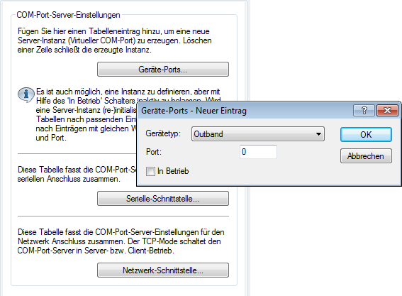 Wenn eine Server-Instanz angelegt oder aktiviert wird, werden die anderen Tabellen der COM-Port-Serverkonfiguration nach Einträgen mit übereinstimmenden Werten für Device-Type und Port-Nummer durchsucht. Falls kein passender Eintrag gefunden wird, verwendet die Server-Instanz sinnvolle Default-Werte.
