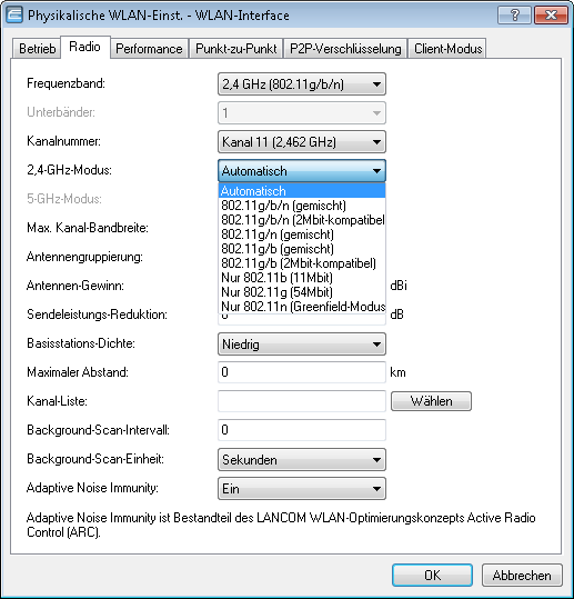- Auch wenn aktuelle WLAN-Adapter in der Regel nach 802.11a/g/n betrieben werden, untertsützen LANCOM APs aus Gründen der Kompatibilität zu älteren WLAN-Adaptern auch den Standard IEEE 802.11b mit bis zu 11 MBit/s Übertragungsrate im 2,4 GHz Frequenzband.