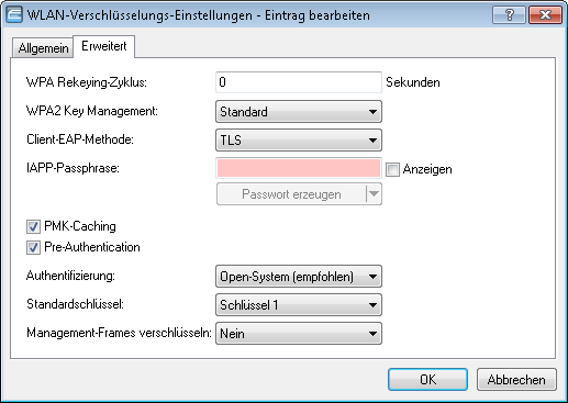 - Standard: Aktiviert das Schlüsselmanagement gemäß dem Standard IEEE 802.11i ohne Fast Roaming und mit SHA-1-basierten Schlüsseln. Die WLAN-Clients müssen in diesem Fall je nach Konfiguration Opportunistic Key Caching, PMK Caching oder Pre-Authentifizierung verwenden.