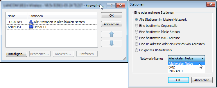 Hier werden die Stationen festgelegt, die als Absender oder Adressat der Pakete durch die Firewall-Regeln verwendet werden sollen. Die Stations-Objekte sind dabei nicht auf Quelle oder Ziel festgelegt, sondern können in den Firewall-Regeln je nach Bedarf verwendet werden. Im Zusammenhang mit ARF ist es z. B. möglich, eine bestimtmes IP-Netzwerk als Stations-Objekt zu definieren.