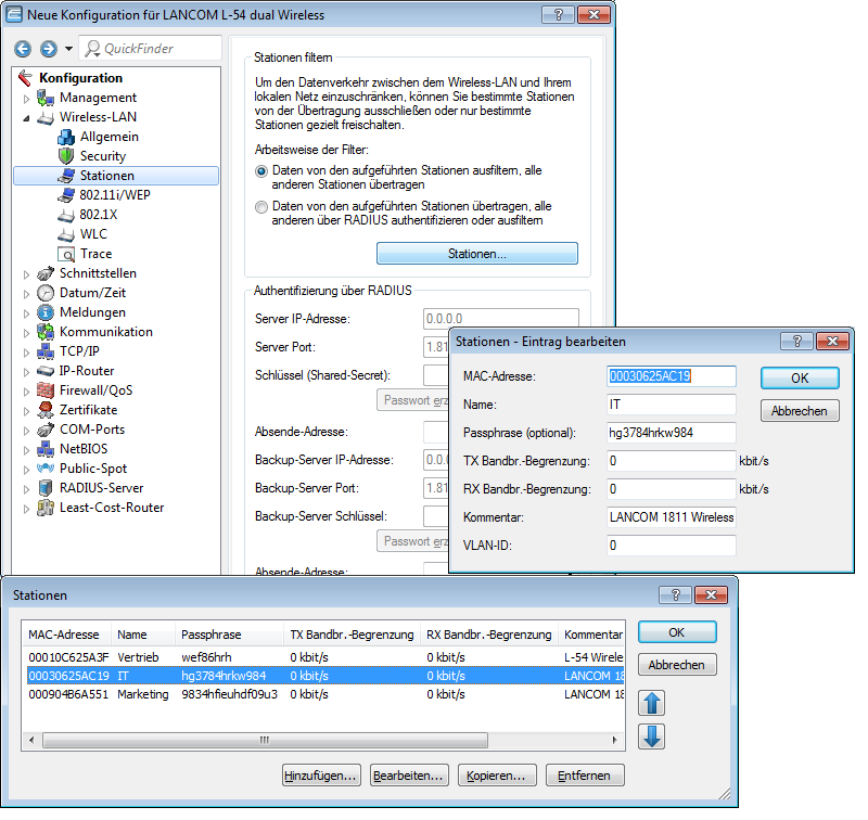 Bei der Konfiguration mit LANconfig geben Sie die Passphrases der im WLAN zugelassenen Stationen (MAC-Adressen) im Konfigurationsbereich 'Wireless-LAN' auf der Registerkarte 'Stationen' unter der Schaltfläche Stationen ein.
