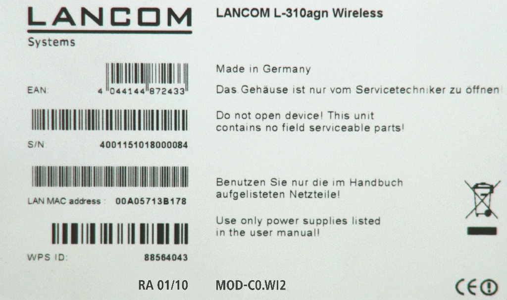 Der Preshared Key für die Standard-WPA-Verschlüsselung setzt sich aus dem Anfangsbuchstaben „L“ gefolgt von der LAN-MAC-Adresse des Access Points in ASCII-Schreibweise zusammen. Die LAN-MAC-Adressen der LANCOM-Geräte beginnen immer mit der Zeichenfolge „00A057“. Sie finden die LAN-MAC-Adresse auf einem Aufkleber auf der Unterseite des Gerätes. Verwenden Sie nur die als „LAN MAC address“ gekennzeichnete Nummer, die mit „00A057“ beginnt. Bei den anderen ggf. angegebenen Nummern handelt es sich nicht um die LAN-MAC-Adresse!