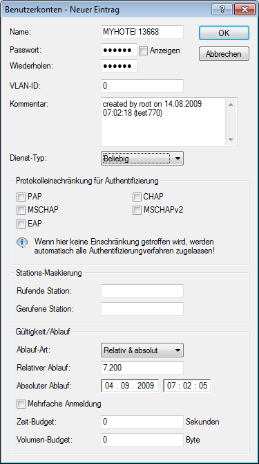 Anmerkung: Die Option für die Mehrfach-Logins muss deaktiviert werden, wenn der RADIUS-Benutzer ein Zeit-Budget erhalten soll. Die Einhaltung des Zeit-Budgets kann nur überwacht werden, wenn für den Benutzer zu jeder Zeit nur eine Sitzung aktiv ist. - Ablauf-Art Diese Option legt fest, wie die Gültigkeitsdauer des Benutzer-Accounts