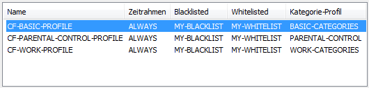 - Kategorieprofile Es existieren drei Kategorieprofie: BASIC-CATEGORIES, WORK-CATEGORIES und PARENTAL-CONTROL. Das Kategorie-Profil enthält die Angaben darüber, welche Kategorien erlaubt und verboten sind und für welche ein sogenannter Override aktiviert ist.