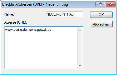 - Adresse (URL) Hier werden die URLs eingetragen, die über diese Blacklist verboten werden sollen.