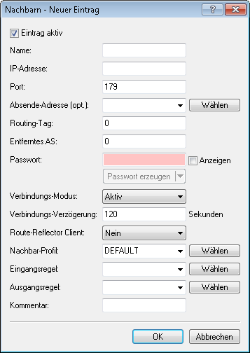 Anmerkung: Bei fehlendem oder falschem Eintrag gilt der BGP-Nachbar als nicht vollständig konfiguriert und eine Verbindung zu ihm ist nicht möglich.