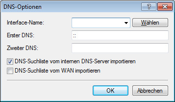 - Gibt an, ob die vom Provider übertragende DNS-Suchliste (z. B. provider-xy.de) in diesem logischen Netzwerk angekündigt werden soll. Diese Funktion steht nur dann zur Verfügung, wenn in der Präfix-Liste das entsprechende WAN-Interface unter Präfix beziehen von verknüpft ist.