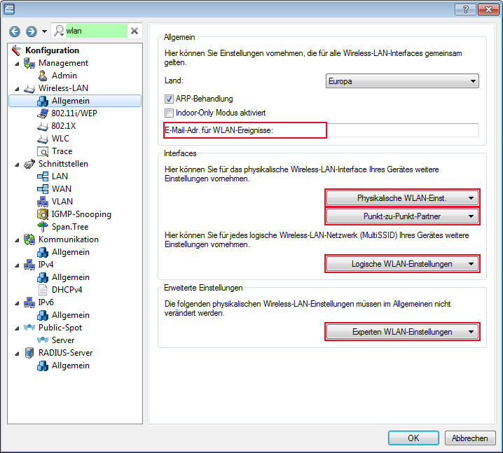 - Geben Sie im Suchfeld den gewünschten Begriff ein, z. B. wlan. Die Suche unterscheidet nicht nach Groß- und Kleinschreibung. Sie können Teile von Worten oder Zahlen ebenso eingeben wie komplette Suchbegriffe. Leerzeichen in den Suchbegriffen suchen auch nur nach Zeichenketten, welche die entsprechenden Leerzeichen enthalten. Die Suchfunktion unterstützt jedoch keine Wildcards.