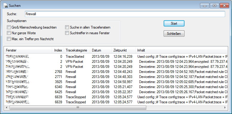 Um also gezielt nach Trace-Einträgen zu einer bestimmten Rubrik oder mit einem bestimmten Datum zu suchen, geben Sie z. B. Firewall oder 2013/08/09 ein und klicken Start.