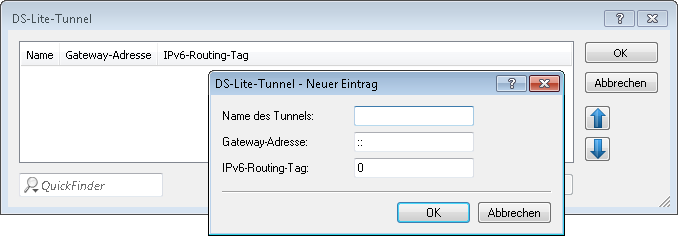 Zur Definition eines DS-Lite-Tunnels benötigt der Router nur die IPv6-Adresse des Tunnel-Endpunkts sowie das Routing-Tag, über das er diese Adresse erreichen kann.