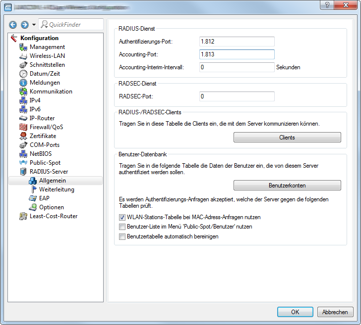 Mit der Auswahl einer Schnittstelle legen Sie fest, auf welchen Schnittstellen die Benutzer-Anmeldung aktiviert wird. Zur Auswahl stehen neben den logischen WLAN-Interfaces, über die sich Public Spot-Benutzer direkt anmelden können, auch die logischen LAN-Interfaces (LAN-1 etc.) und die Point-to-Point-Strecken (P2P-1 etc.). Über LAN- und P2P-Interfaces können Sie weitere Access-Points in den Public Spot eines anderen Gerätes einbeziehen. Wählen Sie für einen singulären Access-Point hingegen z. B. das logische WLAN-Interface WLAN-1.