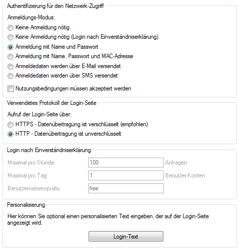 Über den Anmeldungs-Modus legen Sie fest, mit welchen Informationen sich die Benutzer des Public Spot-WLANs anmelden können. Wählen Sie Anmeldung mit Name und Passwort, um Ihren Nutzern z. B. die Anmeldung mit einem individuellen Benutzernamen und einem Passwort zu ermöglichen, das Sie diesen vorab zuweisen. Zusätzlich erlaubt Ihnen dieses Einstellung, über sogenannte Voucher (Tickets) kurzfristig Hotspot-Zugänge für Gäste bereitzustellen.