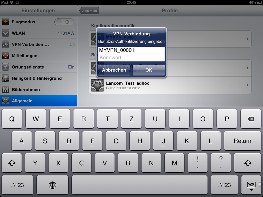 Anmerkung: Das Kennwort ist bereits eingetragen, wenn Sie das Kennwort für die VPN-Verbindung bei der Installation des myVPN-Profils eingegeben haben. In diesem Fall erscheint dieses Fenster nicht, die Verbindung wird direkt hergestellt.