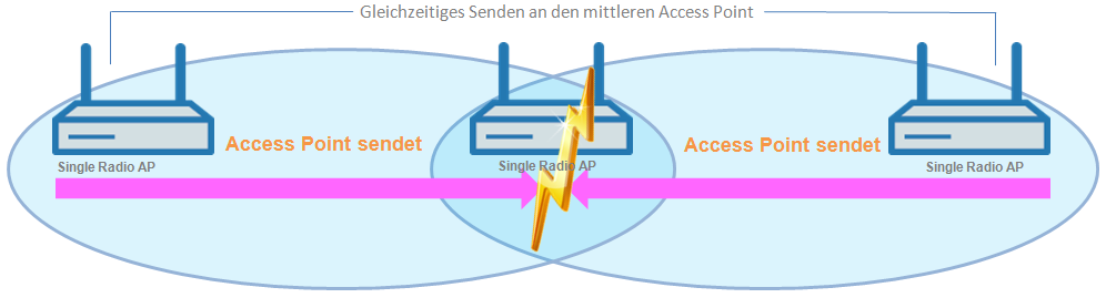 Abbildung 1. Gleichzeitiges senden an den mittleren AP: Die beiden äußeren APs erkennen die Kollision nicht.