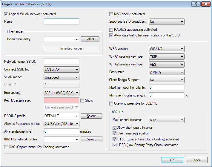 Under you can set the logical WLAN network parameters, which the WLAN controller is to assign to the access points. The following parameters can be defined for each logical WLAN network: