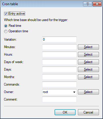 The device determines the actual delay time at random. It lies between 0 and the time entered here. With the variation set to zero the CRON job will be executed at the specified time.