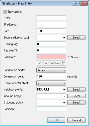 • Delayed: In this mode the device waits for a timeout before it tries to connect to the BGP neighbor. The conditions for establishing a connection are the same as for the "Active" mode.