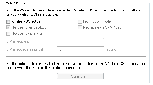 - Here you configure the various thresholds and measuring intervals (packets per second) of the different WIDS alarm functions. These settings are used by the WIDS to determine if an attack is taking place.