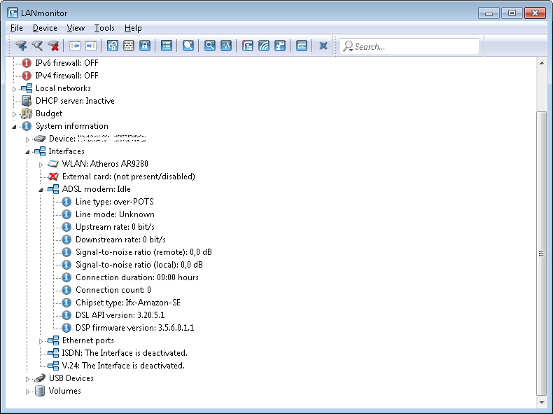 LANmonitor can be used to read out the status values for each registered device with an ADSL/VDSL modem in the section .