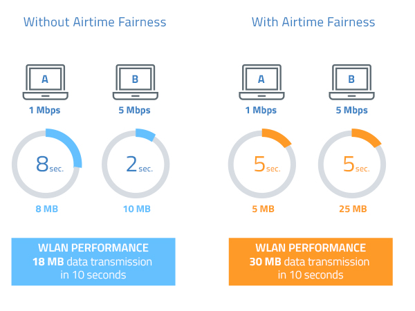 By fairly sharing the WLAN transmission time between all of the active clients, the available bandwidth is used to maximum effect and WLAN performance is improved.